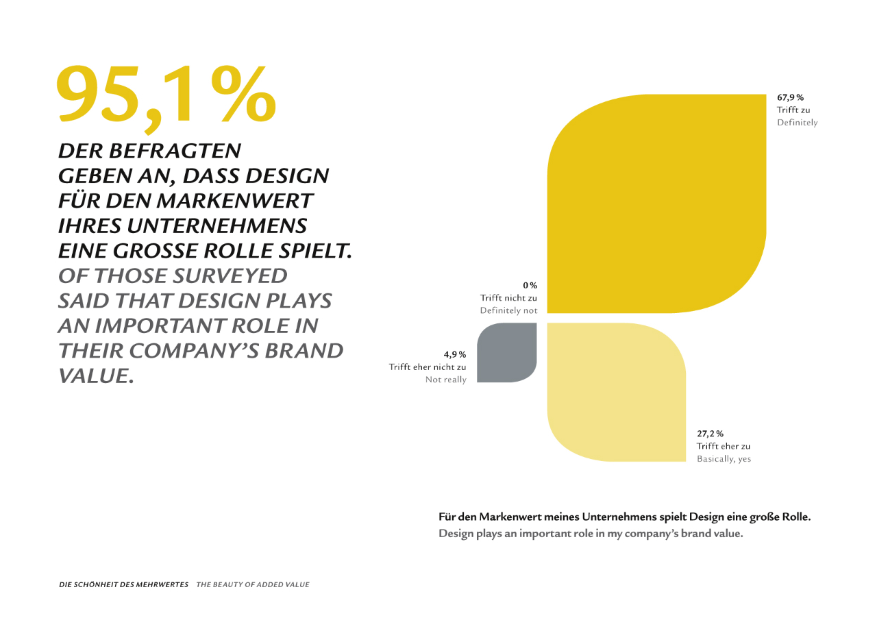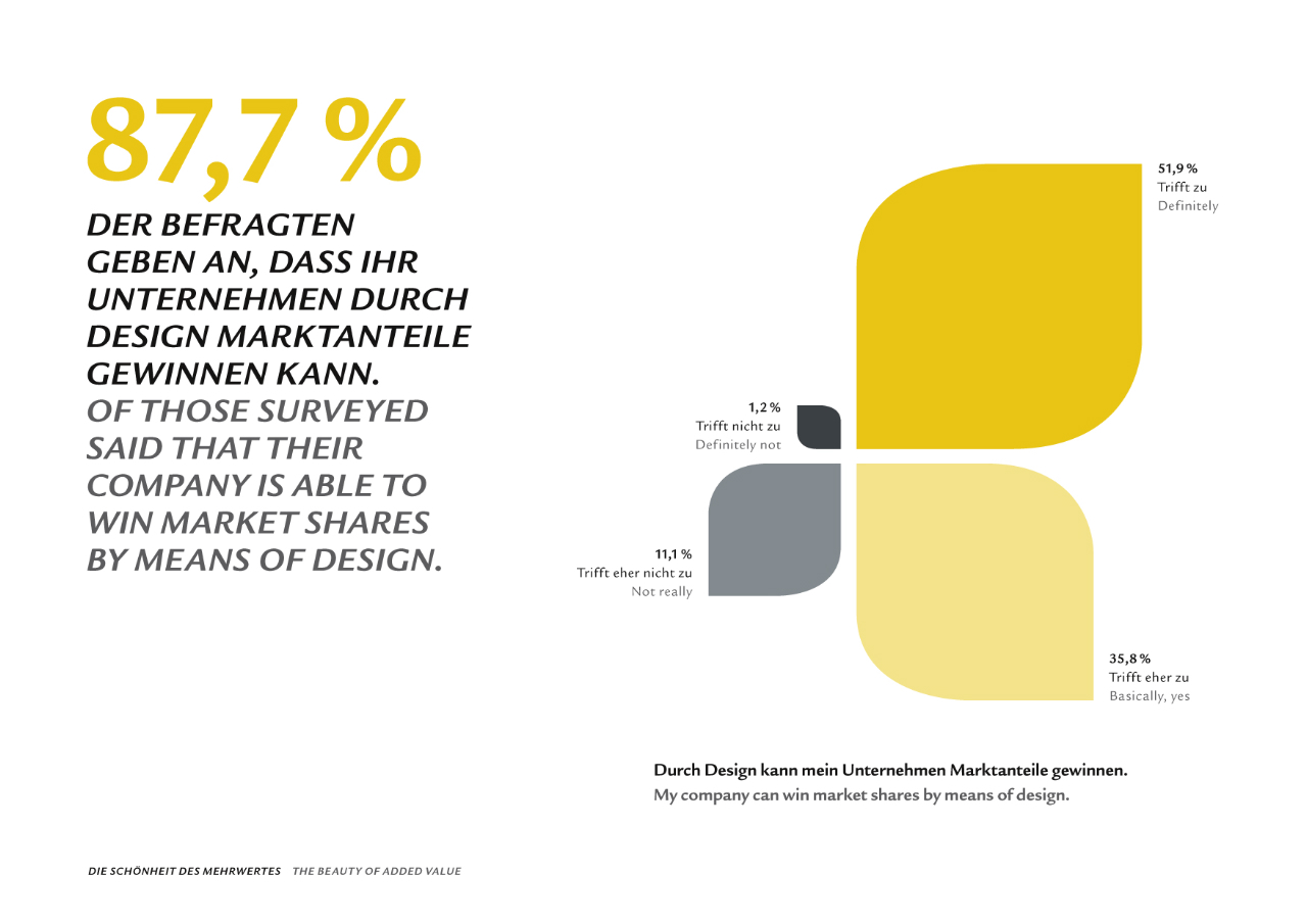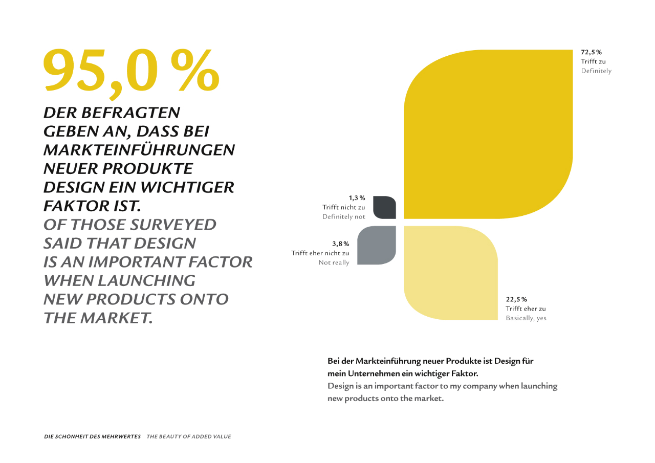 Design spielt als Erfolgsfaktor in immer mehr Unternehmensbereichen eine immer größere Rolle. Deutlichen Mehrwert durch Design sehen Unternehmen bei der Einführung neuer Produkte, bei der Gewinnung von Marktanteilen sowie bei der Preisgestaltung, so ausgewählte Ergebnisse von „Die Schönheit des Mehrwerts“. Diese Studie ist gegenwärtig Deutschlands größte Unternehmensbefragung zum Thema Design und wurde vom Markenverband gemeinsam mit dem Rat für Formgebung und der Agenturgruppe Scholz & Friends durchgeführt.